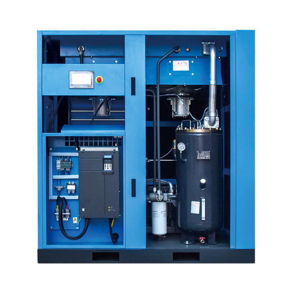 1、采用高能效水平双级主机,高效、低噪音、低振动、高可靠性,每级压缩比小,泄露更小,容积效率更高。相同功率下由两个机头承担负荷,轴承受力小,寿命更长。